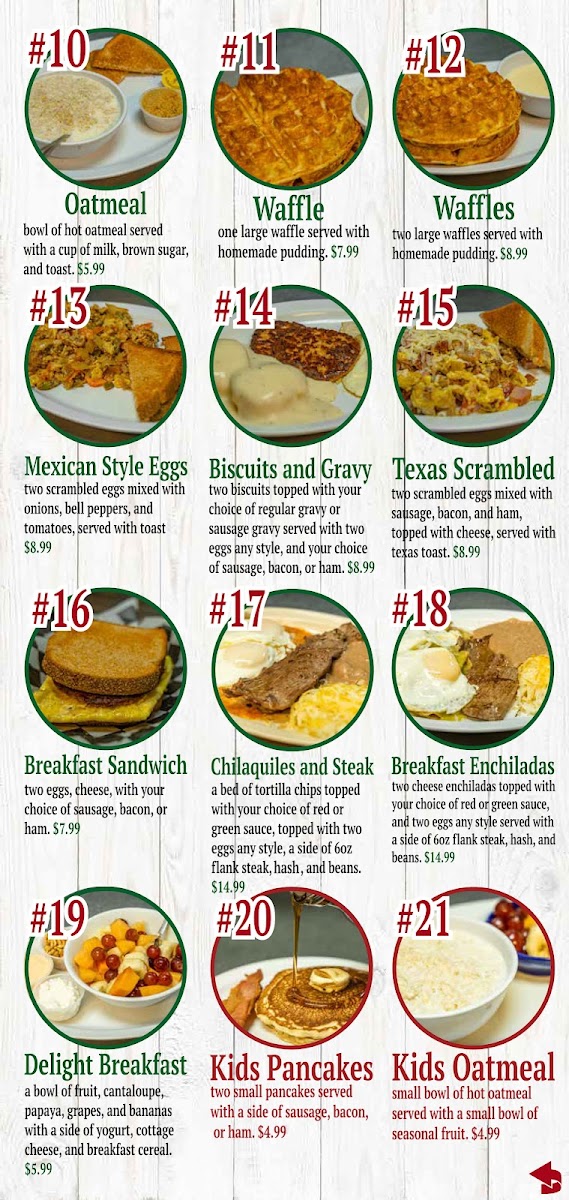 Two scrambled eggs with your choice of sausage, bacon, ham, chorizo, hash, beans, bell peppers, jalapeños, onions, or cheese.